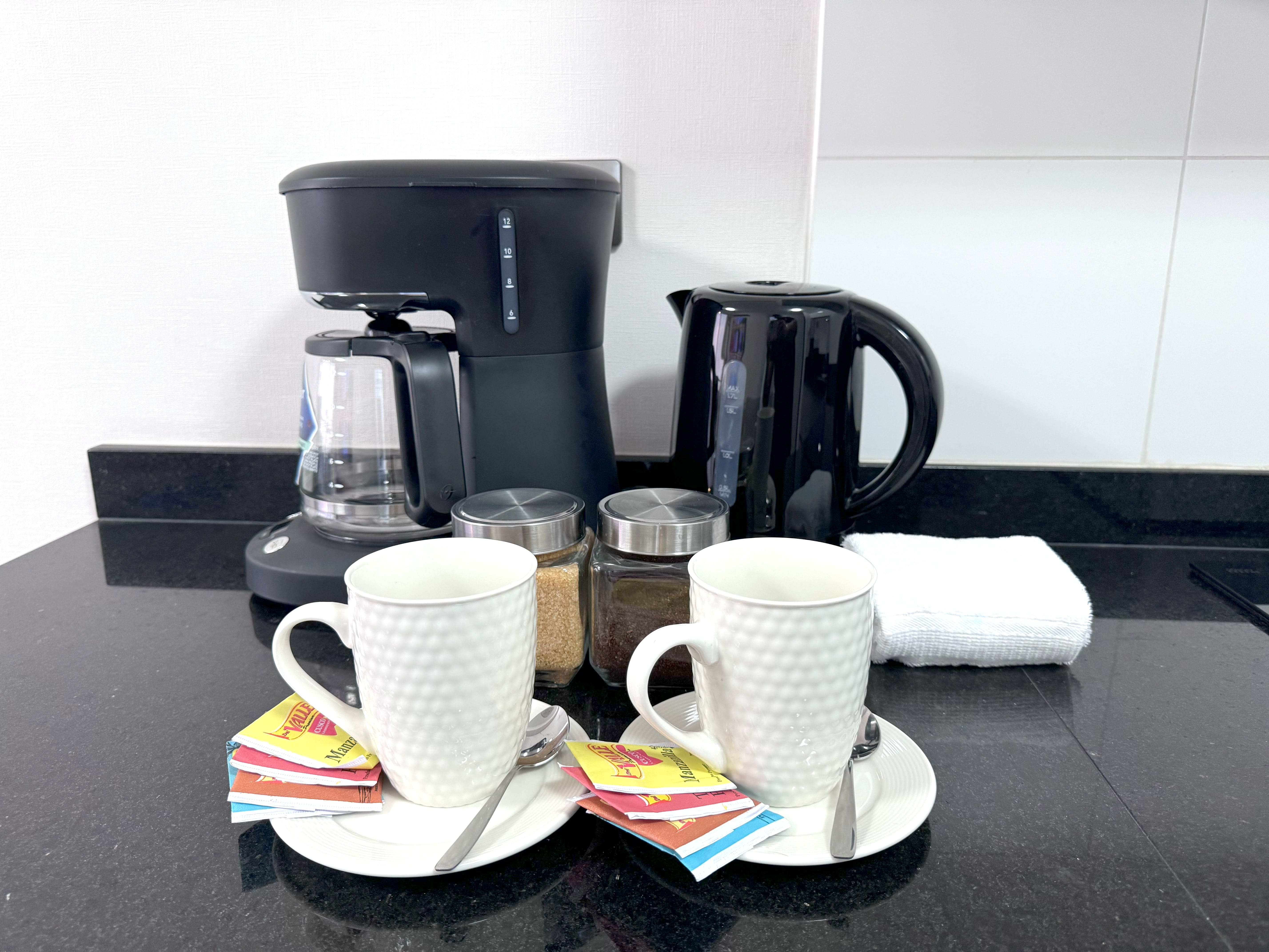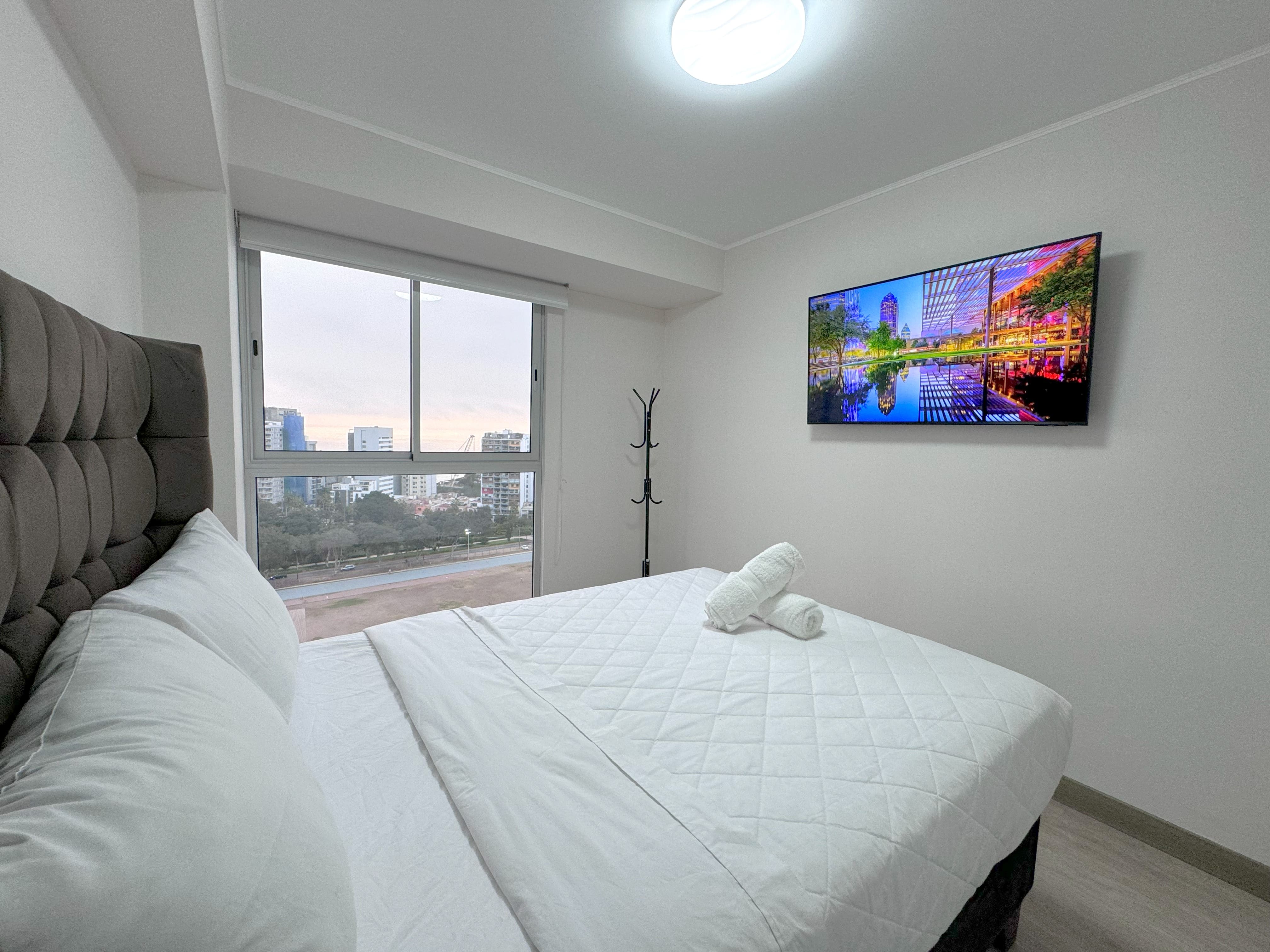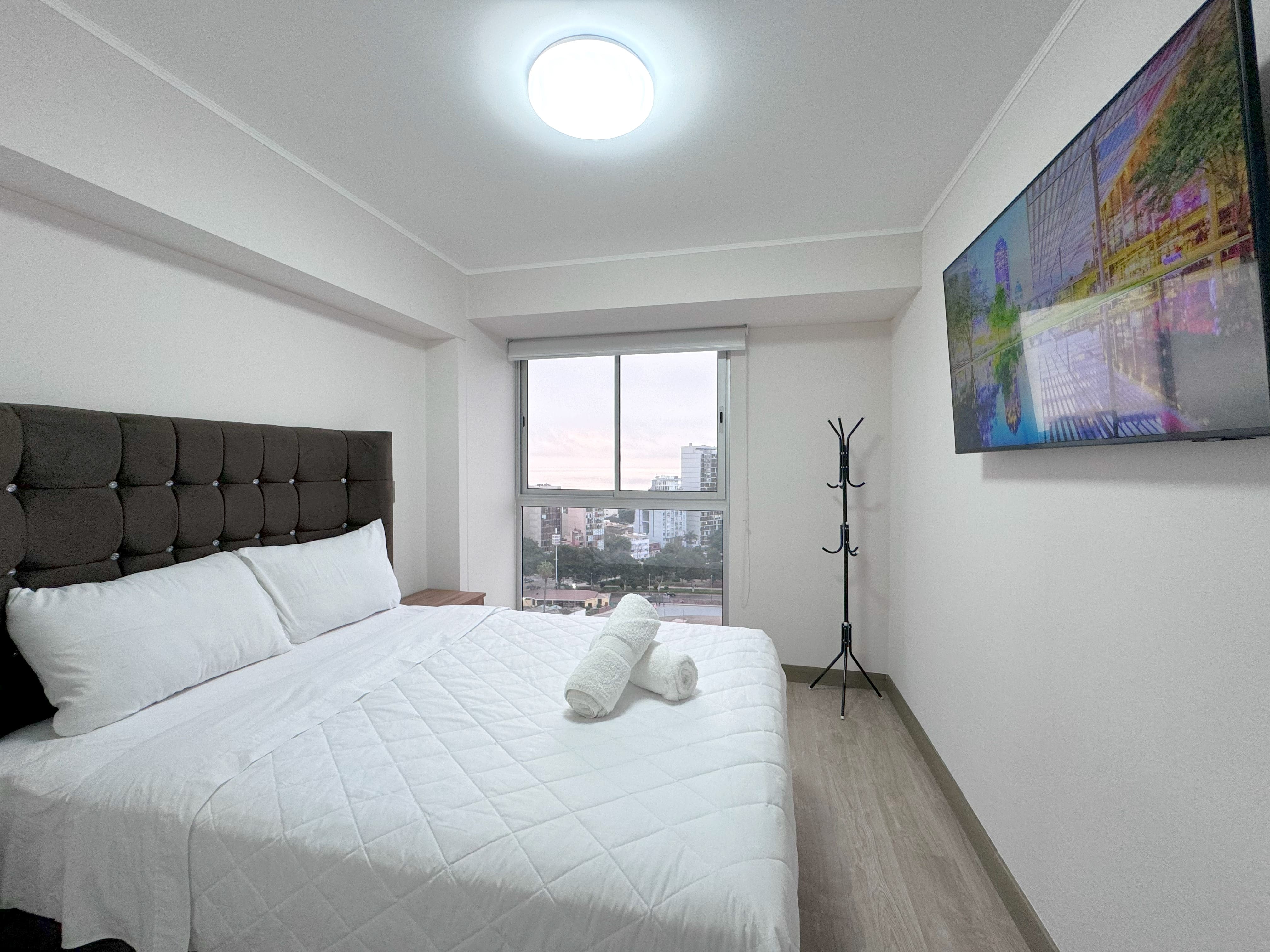 El tranquilo dormitorio, con una cama cómoda, armario moderno y Smart TV de 50 pulgadas, corona la experiencia con su cautivador horizonte marino a través de la ventana.